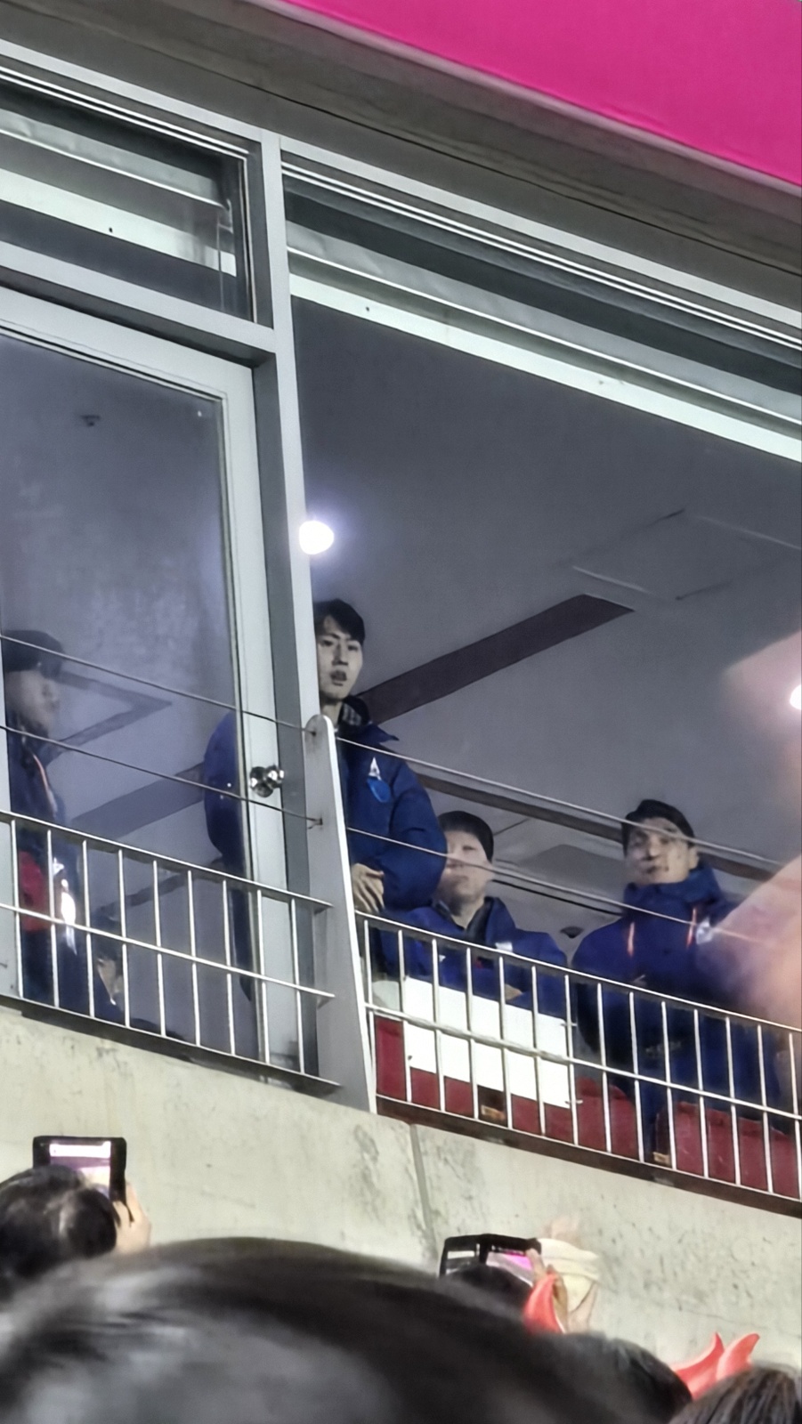 이번 요르단전에 아쉬운 얼굴들이 많았습니다. 특히나 부상으로 참여 못하게 된 이강인, 김민재, 백승호 선수등과 주민규 선수등 경기에 나오지 못하여 너무 아쉬웠지만 관중석에 잠깐 나타난 모습을 보자마자 급하게 사진을 찍었습니다.